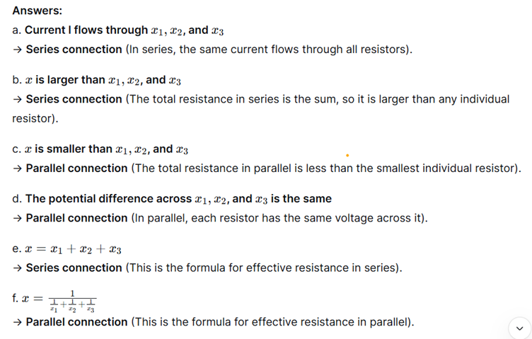 Question 8: Three resistances x1,x2x1,x2, and x3x3 are connected in a circuit in different ways. xx is the effective resistance. Match the properties to the connection type.