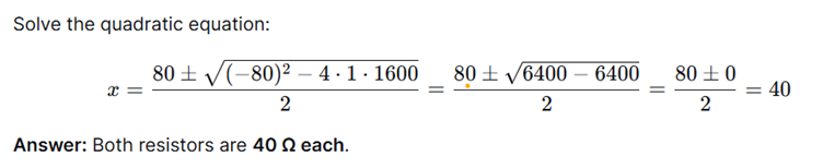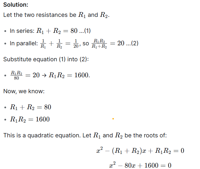 B. When two resistors are connected in series, their effective resistance is 80 Ω. When they are connected in parallel, their effective resistance is 20 Ω. What are the values of the two resistances?